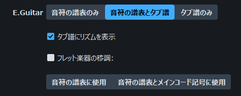 Doricoでは、プレーヤー毎に、五線譜とタブ譜を「いずれか」もしくは「併記」での表示ができます。