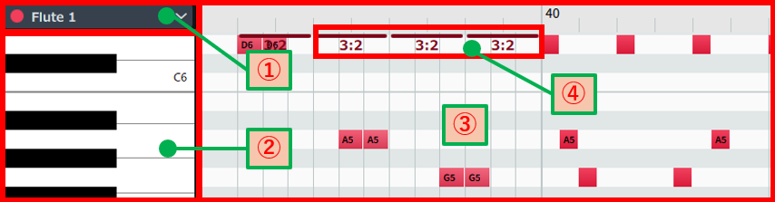| ③ | ピアノロール | 記譜されている音符が、MIDIノートとして表示されます。 縦がピッチの軸で、横は時間(デュレーション)の軸です。 |