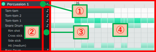 | ④ | 打楽器エディター | 構成する打楽器毎に記譜されている音符が、MIDIノートとして表示されます。 縦が構成数打楽器と演奏技法の軸で、横は時間(デュレーション)の軸です。 |