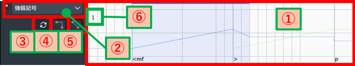 | ① | エディターエリア | 「鉛筆」や「ライン」で新規で直接入力したり、「ドラッグ」で値を変更できます。 また、譜面上で設定された「『mf』『クレッシェンド』などの強弱記号」なども「ポイント」や「ライン」により、反映されます。 なお、譜面上で設定済みの「強弱記号(クレッシェンドを含む)」は、エディター下部に表示されます。 |
