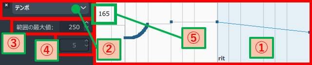 | ⑤ | テンポ値の表示 | 選択した「MIDIポイント」と次の「MIDIポイント」の値を直線で接続します |