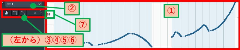 | ⑥ | CC値 | エディター内で選択した「ポイント」の値を表示します。 選択した「ポイント」に対し、数値による変更も可能です。 |