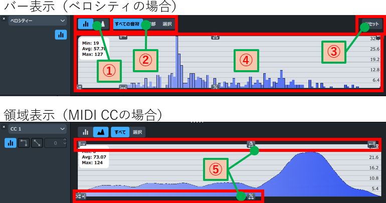 「バー」と「領域」のチャートを用いて、「ベロシティ」「MIDI CC」が取りうる値に対する「音符数の分布(度数分布)の確認」「全体的に施す編集」を行うことができます。