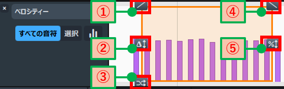 | ④ | ベロシティの編集範囲 | ベロシティ値を変更する対象を変更できます。