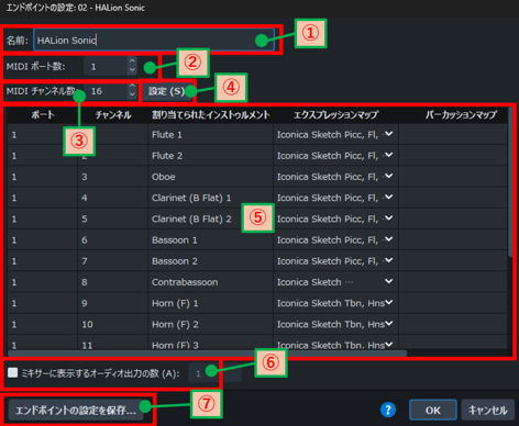 | ⑤ | エンドポイントの一覧 | 対象のプラグインのエンドポイントの設定が表示されます。 「エクスプレッションマップ」「パーカッションマップ」については、この画面で変更可能です。 |