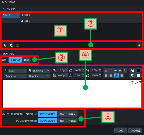 | ① | 対象のセクションプレーヤーに対して構成するディヴィジの内容を表示します。 ②のアクションバーにおいて、作成された「グループ」「ソロ」「セクション」が並びます。 |